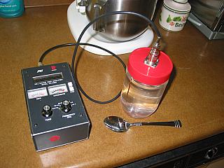 Encha o recipiente com água, coloque a tampa e meça a SWR – ela estará bem alta. Agora, usando uma colher, adicione uma minúscula porção de sal á agua, tampe novamente e meça a SWR – ela estará um pouco mais baixa. Continue adicionando sal até que a SWR esteja 1:1. Você terá que alcançar o ponto de 1:1 sem ultrapassá-lo. Se você ultrapassar este ponto, terá que jogar um pouco de água fora e adicionar mais água limpa. A quantidade ideal de sal que você precisa dependerá em quanto condutiva sua água estará assim que sair da torneira.