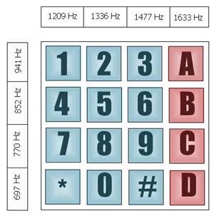 Logo depois, eles adicionaram um oitavo tom aos 7 primeiros. Com essa nova matriz 4×4 (Fig.1) conseguiram 16 combinações diferentes. Foram então adicionadas as letras A, B, C e D, aumentando as possibilidades de controle. Note que a coluna 4 não é comum estar presente em aparelhos telefônicos, mas está presente em quase todos os teclados de rádios de VHF/UHF para radioamador.
