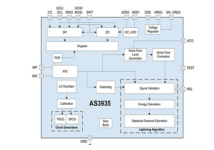 O AS3935 Franklin Lighting Sensor IC da austriamicrosystems usa um front end
