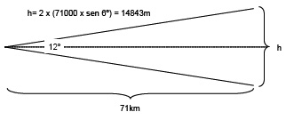 O diagrama a seguir mostra que uma frente de onda radiada a partir de uma antena com 12º de abertura terá a altura aproximada de 15km a uma distância de 71km da antena.
