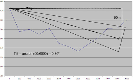 Esse circulo está centrado na posição da repetidora e considera uma cobertura omni-direcional. A partir da repetidora traçamos um raio que passe pelo centro da cidade e sobre ele fazemos uma análise topográfica. Como era de se esperar, considerando que a repetidora está localizada em uma região mais alta, o perfil analisado mostra alguns vales a serem cobertos, mas nenhum obstáculo. Como os eixos do gráfico não estão na mesma escala, o problema não é tão sério como parece. Ao calcularmos o “tilt” negativo necessário a otimizar a cobertura nos vales, chegamos à conclusão que cerca de 1º já é suficiente. Para o mesmo mastro de 2,8m, o topo do mastro deverá estar avançado de 5cm em ralação à parte inferior, considerando-se como referência o prumo e não a torre. A segunda antena poderá então ser instalada na metade da torre, para criar um certo desacoplamento entre esta e a primeira instalada no topo, com azimute de 112º. Esse azimute otimiza o sinal para o centro e para a região oposta da cidade, além de otimiza do apontamento para a região de Campinas.