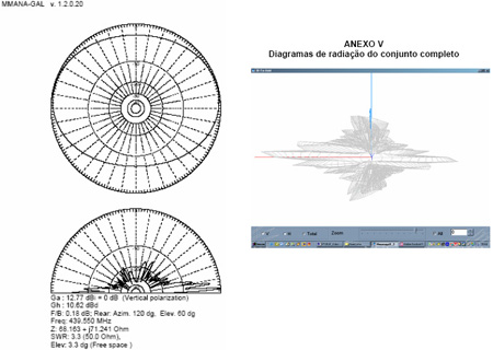 A simulação foi realizada com o auxílio do programa MMANA-GAL, uma versão elaborada por radioamadores utilizando o núcleo do conhecido simulador de antenas NEC-4. (http://mmhamsoft.amateur-radio.ca/)