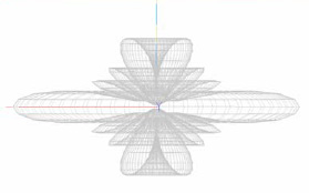 Para tal, precisamos compreender como se comporta a frente de onda ao sair da antena. Os diagramas mostrados no Anexo III auxiliam nessa compreensão. Por exemplo, a figura 1 mostra os diagramas de radiação horizontal e vertical de um dipolo simples. O diagrama horizontal mostra os 360º no entorno da antena como se estivéssemos olhando a antena por cima, uma vista aérea. Os círculos concêntricos representam uma escala de atenuação calibrada a cada 10 dB. O circulo externo corresponde a 0 dB e os internos a -10 dB, -20dB, etc. O ganho da antena, na direção de máxima radiação não é explicitado no gráfico, mas está descrito no texto abaixo dele. Para esse dipolo simples o ganho é de 2,17 dBi, que equivale a 0 dB no gráfico. Como o dipolo vertical, como o aqui demonstrado, irradia igualmente em qualquer direção horizontal (qualquer azimute), seu diagrama de radiação horizontal corresponde a um circulo sobre o perímetro externo de 0 dB (omnidirecional). Já o diagrama vertical é bem diferente. Um dipolo não radia pelas pontas e tem sua máxima radiação no sentido perpendicular ao seu eixo. É por isso que o diagrama de radiação vertical tem a aparência de um oito. Olhando a visão tridimensional desse diagrama, na figura 5 do Anexo III, notamos que o diagrama parece com um “pneu”, tecnicamente conhecido como toróide (os americanos diriam que é um Donut).
